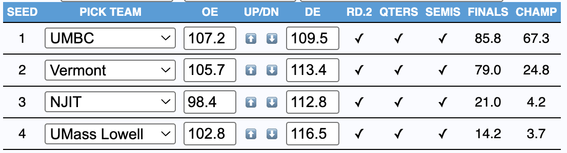 At press time there's a ~68% chance of a UMBC/Vermont final, which feels very fair because UMBC was clearly the best team in conference play and Vermont clearly the best team over the first few weeks of the season. I can't proclaim I love either for March purposes, but hey, that's why they play the games.