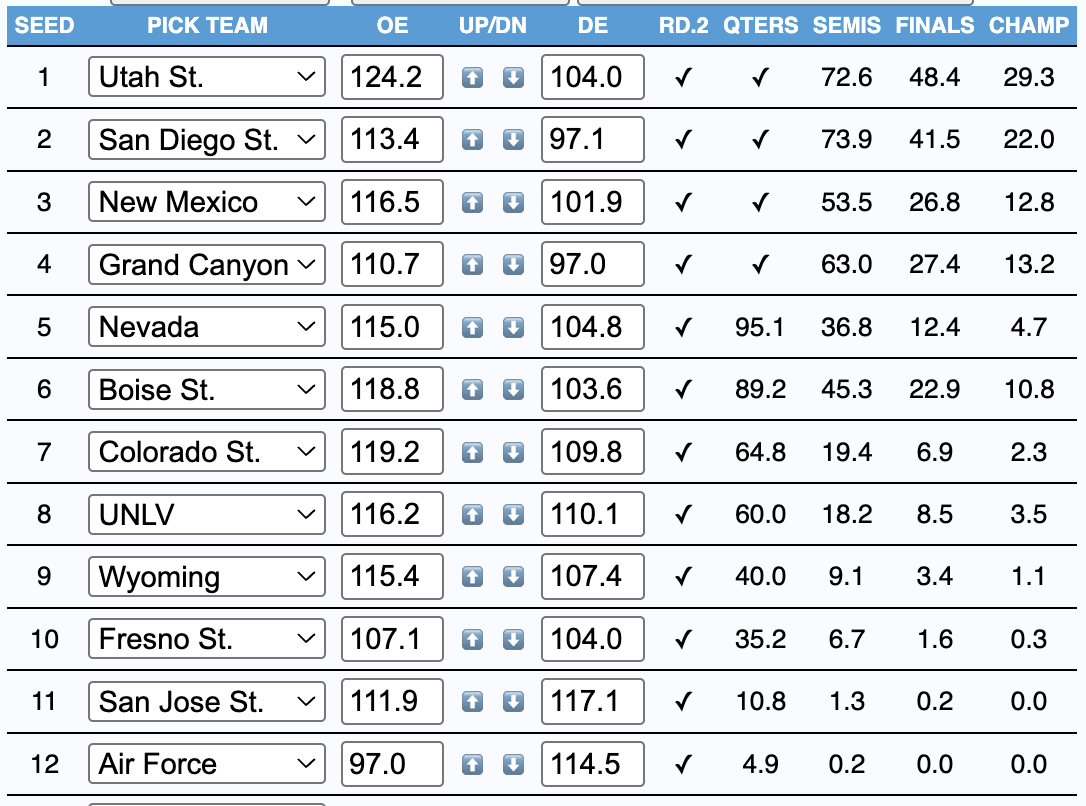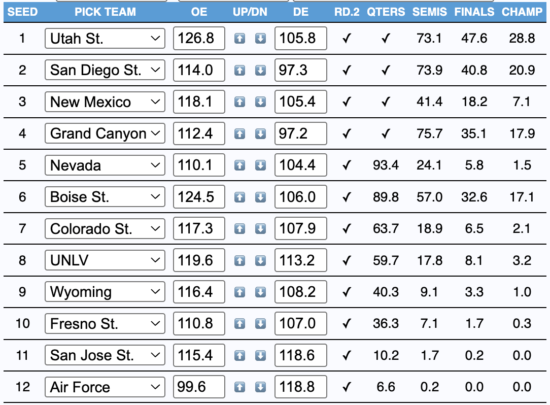 Utah State is the minor favorite here and for good reason, but over the last month, they've been the league's second-best team by efficiency and third-best by record. Both Colorado State (8-1) and Boise State (7-2) have been better, with Boise rounding into form by demolishing competition on the boards and Colorado State riding - you guessed it - a shooting heater. Those are your 6 and 7-seeds in this tournament, by the way. Plus, tournament host UNLV has played better lately, and all of New Mexico, San Diego State, and Grand Canyon (the league's best defense since February 1) are super dangerous. If you just did odds based on the last 12 games (roughly six weeks of play) it might tell the story better: