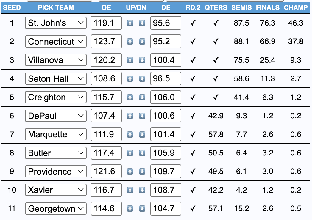 The winner is… The final is pretty normal, as St. John's takes down UConn and probably eliminates UConn from the 1 line. Something way more notable happened in this single simulation: SEMIFINALIST DEPAUL. May we be so lucky to experience that.