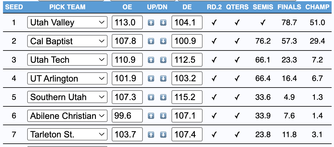 Best pick for March Madness: Utah Valley is a very scary potential matchup on the 12 or 13 lines for whoever gets them. Their top 10 comps at Torvik went 5-5 in the Round of 64, including 2007-08 Western Kentucky (Sweet Sixteen). They force a lot of turnovers, get a lot of second-chance points, have outstanding rim protection, and don't allow many threes. That being said, I'd have no problem with Cal Baptist doing it, either. They're +10.7 on the boards per 100 and run a wonky defense that's nearly top-50 in the country.