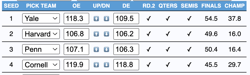 - Darkhorses: Cornell (29.7%), Penn (16.4%), Harvard (16%)