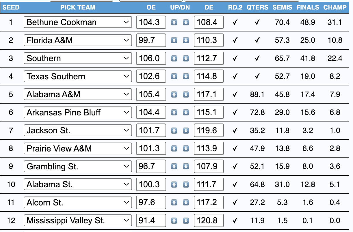 - Darkhorses: Southern (22.4%), Florida A&M (10.8%)