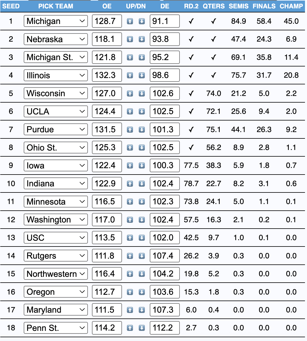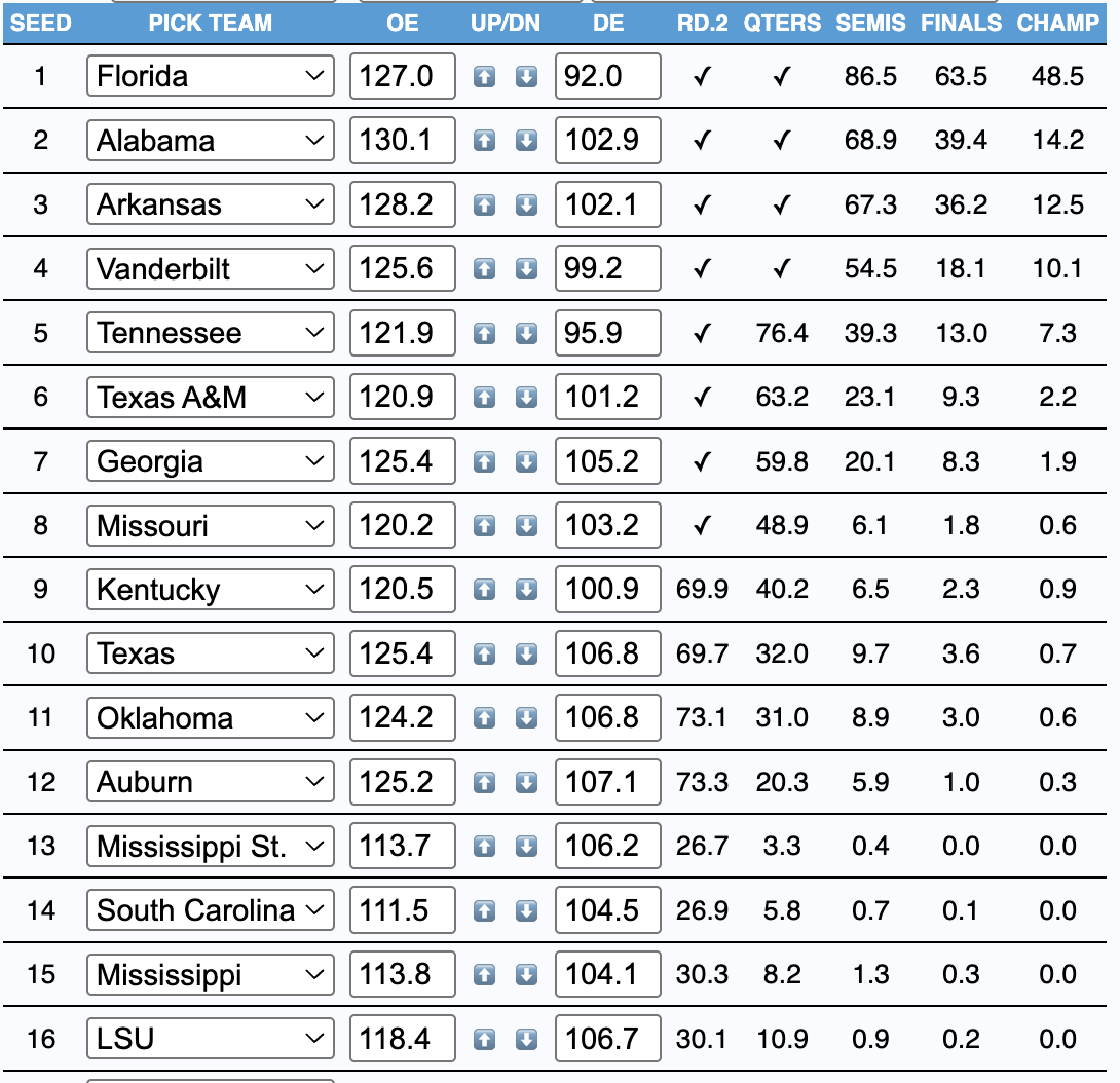The winner is… Kinda boring: Florida over Alabama in the championship game, probably to secure a 1 seed. Interestingly, Ole Miss made a run to the quarterfinals, defeating Texas and Georgia in the process. I imagine that would knock Texas out firmly, which is indeed very funny as a result.
