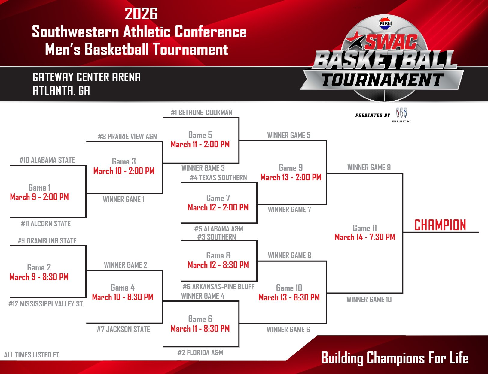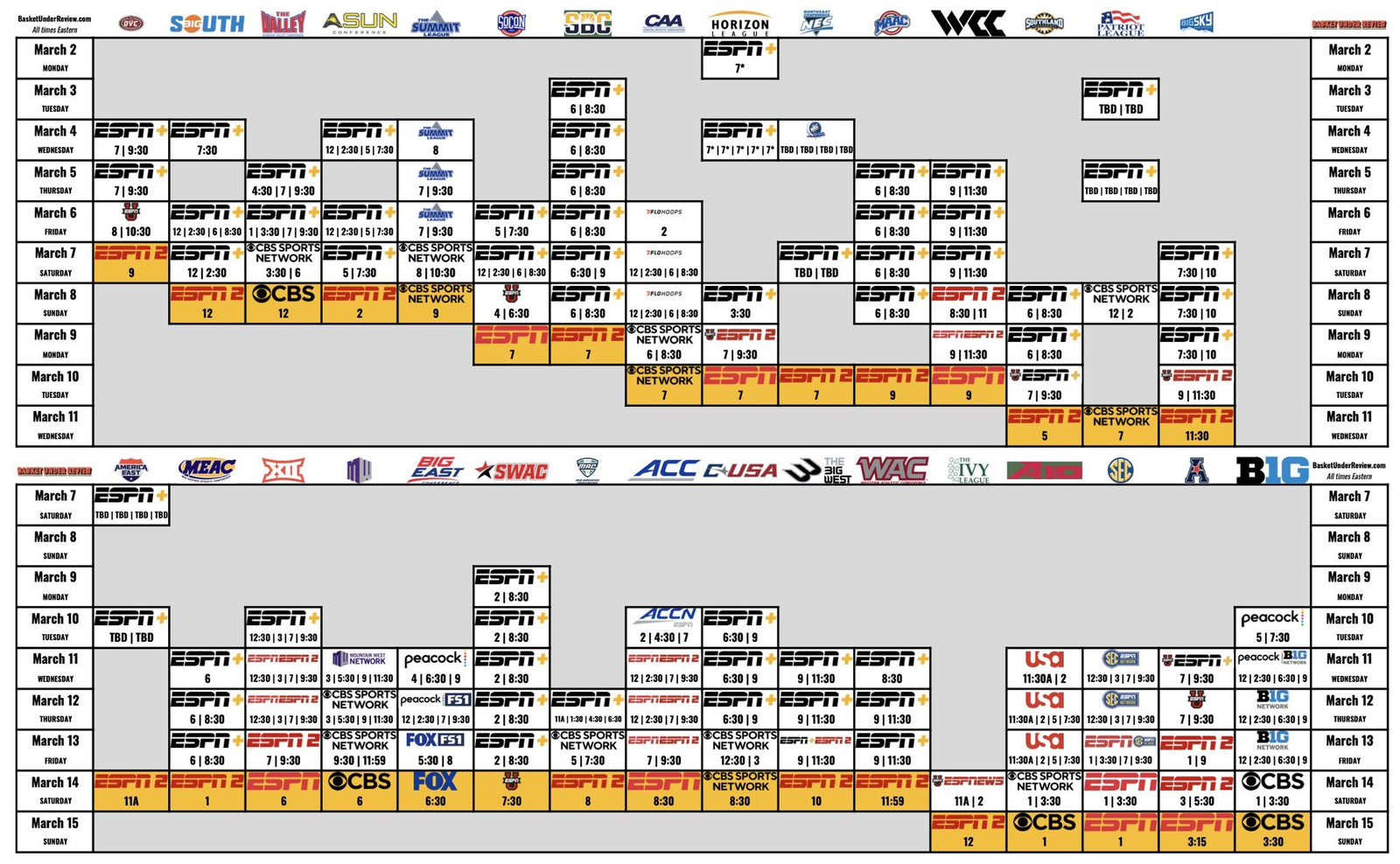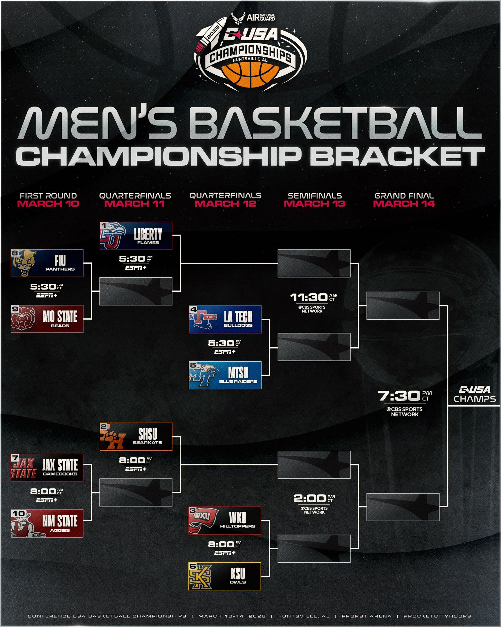 Championship game: March 14 (Saturday) on ESPNU, 7:30 PM ET