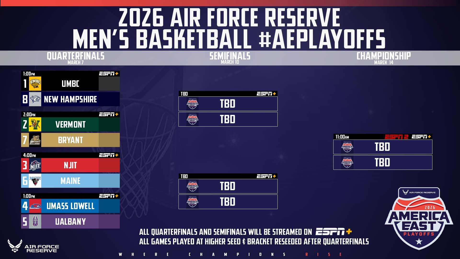 We join this one in progress, as the AEast's format is elongated for reasons beyond my control and my comprehension and functions like an extended regular season. Maybe that's why the favorites usually win this tournament! (Also that the higher seed hosts each round.)