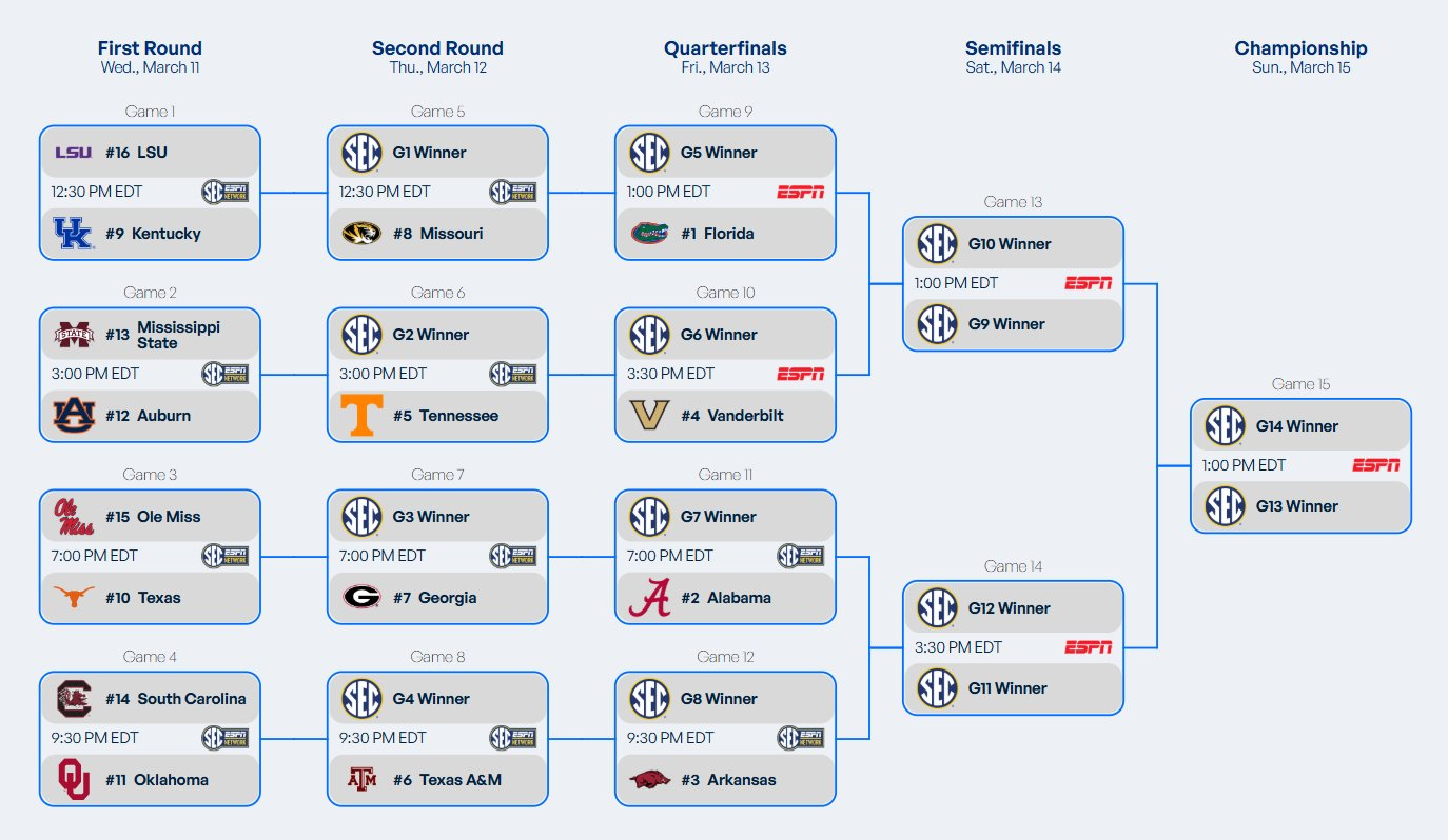 Well, time for this again. The SEC Tournament does typically deliver some intriguing results, even if the last few finals have been duds. As I write, I'm scanning the list of previous Tournaments, and...I guess the COVID-era Alabama/LSU game of 2021 is the last good one? And before that, Kentucky/Tennessee in 2018. Anyway! The semifinals are usually very good, and SEC Friday almost always has one wire-to-wire banger that reminds you why you watch.