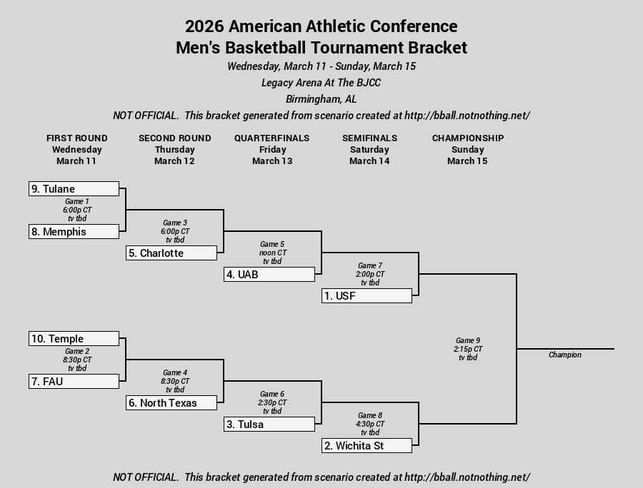 I promise that at one time - 2019 - this was a really good league. Not the case now! This is firmly a one-bid league, and it is what it is. Also, sorry if you're an AAC superfan, but you guys have to move this game. Please play it on, like, Friday. We don't need to hold up the Selection Show any longer. Tulsa and South Florida are the only teams you need to know. Exactly two times in this league's history (2016 and 2024) has someone come from beyond the top three seeds to get it done, so perhaps you should know about Wichita State, who...oh God, did defeat beat USF and Tulsa at least once this year.