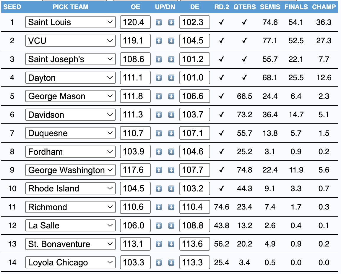 The winner is… Alright, this simulation didn't go as I'd hoped, with Saint Louis defeating Davidson (!) in the final on Sunday. I'm openly rooting for SLU to lose in the semis and VCU to lose in the final to whoever (probably Dayton) to get this league to three bids.