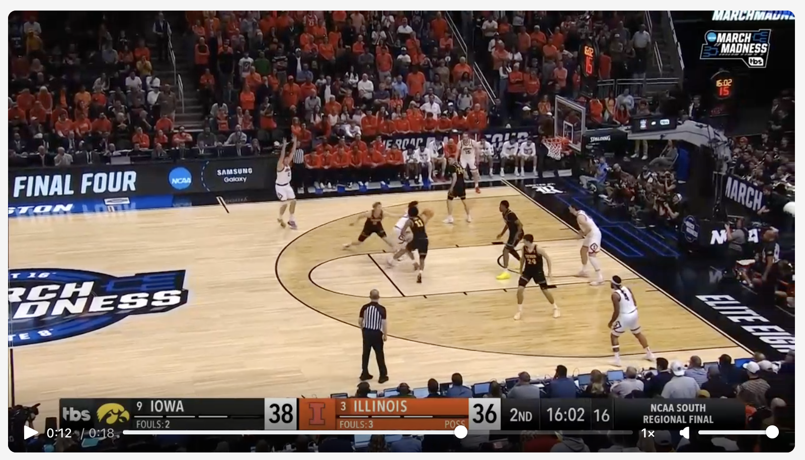 Above is one of my favorite defensive possessions from the Iowa game. Illinois never sends two to the ball, Iowa can never create a matchup advantage, Iowa has no interest in attacking to massive Ivisic, and then the Hawkeyes settle for a heavily contested deep 3-pointer. In a tie game with 10 minutes left in the Elite Eight, it doesn't get much better than this.