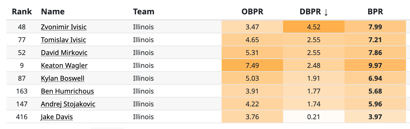 Having the sport's premier dunker and two of its best low-usage spacers is truly the underrated part of Illinois' offense. Yes, Wagler's brilliance, Mirkovic's versatility, Stojakovic's downhill attack, and Boswell/Ivisic's connectivity is what is usually apparent, but that is all set up with the spacing, gravity, and rim pressure of Humrichous, Davis, and Ivisic.