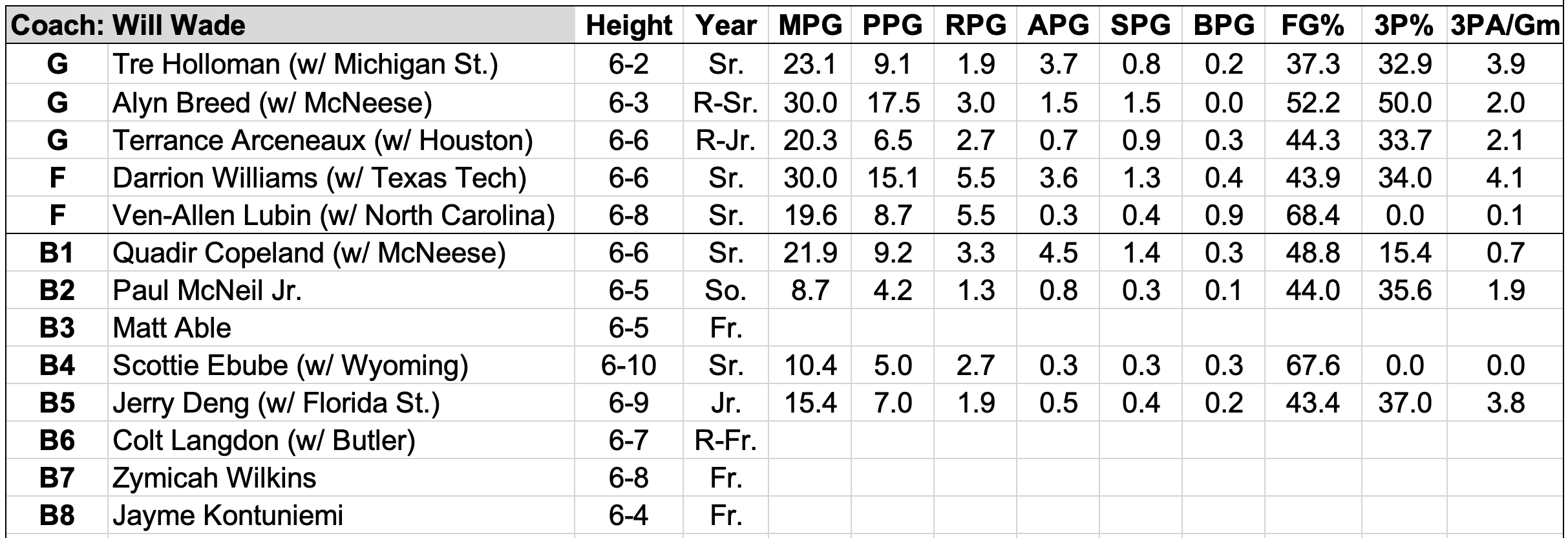 Breed’s stats in the roster chart above is misleading, since he only played two games a year ago at McNeese. When healthy, if healthy, he profiles as a secondary creator / scorer next to Holloman. In general, the guards on this roster are not high usage, 'I need the ball in my hands' guys. Rather, they appropriately complement to Williams as lower usage scorers, shooters and facilitators who can play off of Williams.