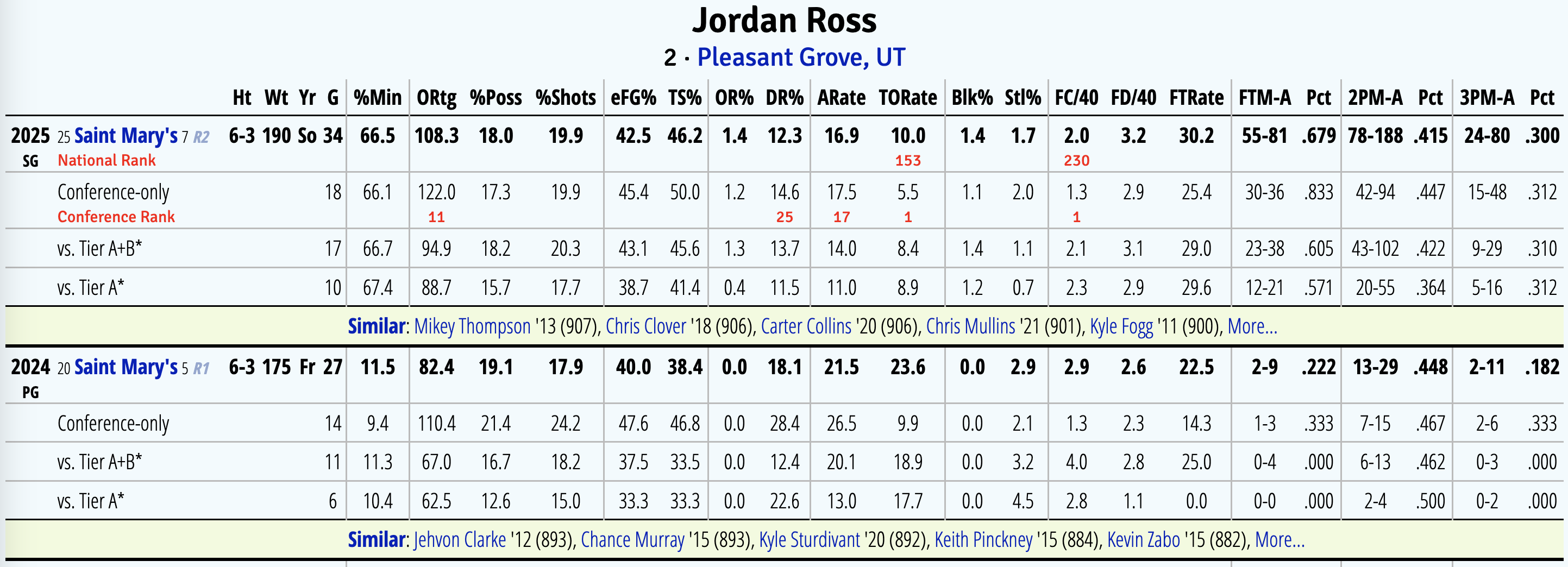 Non-Gael fans might confuse Lewis and Ross, but remember that Lewis is effectively a year behind Ross in his development arc. Just look at Ross’ year 1 to year 2 statistical profile evolution, per KenPom, below. It’s entirely imaginable that Bennett harnesses a similar leap from Lewis this season, akin to the leap Ross took last year (especially in conference play).