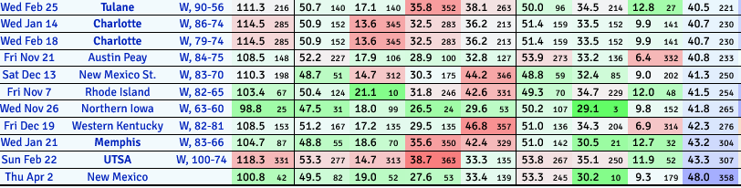 - New Mexico loves to play off non shooters and be aggressive in their help and rim denial (99th percentile jump shot rate allowed, 3rd percentile rim rate allowed), but Tulsa doesn't play a non shooter 1-4, so there's really no one to dork here. The Hurricane shot nearly 40% on a top 40 3PTA rate, with a 97th percentile jump shot efficiency rating and a 98th percentile catch and shoot efficiency rating. Basically any offense that allowed north of a 40% 3PTA rate was ran through the shredder by Tulsa's spread offense.