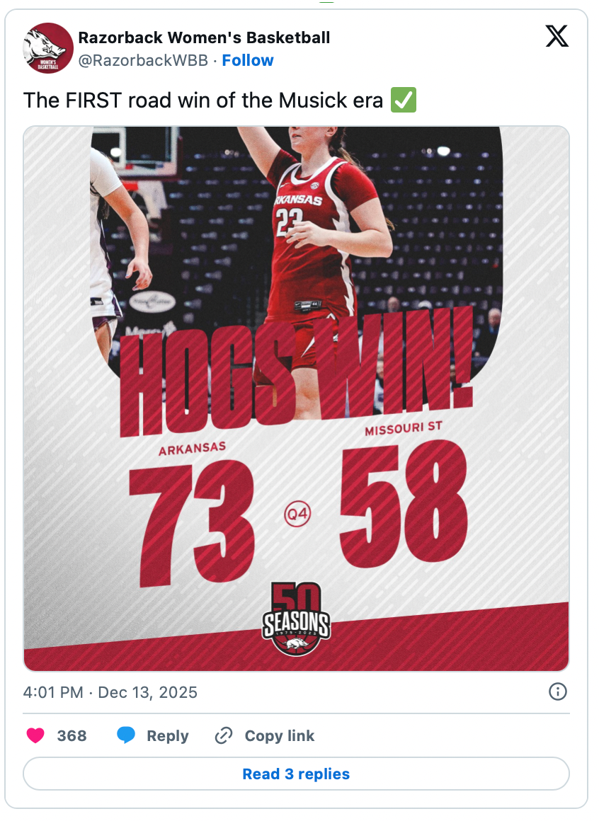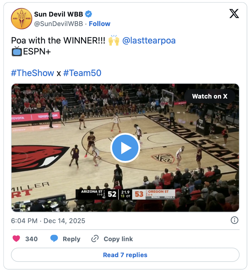 Arizona State now sits at 12-0 on the season and has continued their hot streak to begin the season with two wins on the road this past week. After beating Penn State and Oregon State, there is a sense of legitimacy to the start of the season, but this week for Arizona State doesn't get any easier. They travel to take on Gonzaga and then host their Big 12 opener against Colorado this week. A 2-0 week would be quite the feather in the cap for coach Molly Miller and crew.