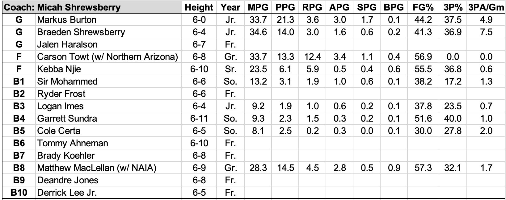 The luxury with this year’s roster is the lineup flexibility off the ball. Burton will surely be at the epicenter of the offense but keeping him and baby Shrews fresh may pay dividends in the dog days of conference play. This sneaky sophomore class all clocked 10 minutes a game last season - Logan Imes, Garrett Sundra and Cole Certa - and notched critical big game experience. Freshmen Ryder Frost, Tommy Ahneman and Brady Koehler are the other three fringe top-100 prospects who fit into Shrewsbury's developmental wheelhouse. Of this supporting cast group, I’m most bullish on Frost, a deadeye shooter, and Ahneman, a skilled low post operator with adept footwork and touch.