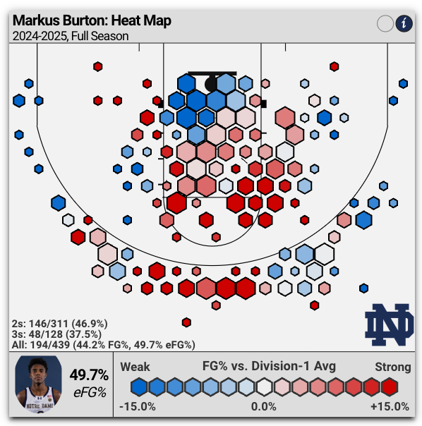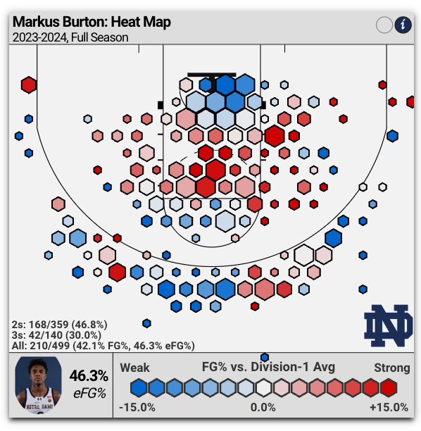 Not to discount the value in bringing back Markus Burton and Braeden Shrewsberry but the skeleton key to a potential NCAA Tournament at-large bid lies in the others. Burton does deserve credit for elevating his efficiency as a shotmaker. As the CBBAnalytics.com comparable visuals below show, Burton didn’t alter his shot diet much at all last season. He simply started to find the range from distance, as his 3-point percentages shot up substantially over his rookie campaign. His mid range will always be the bread and butter of his scoring bag but he needs to make 3s at a high rate to balance out the analytics.