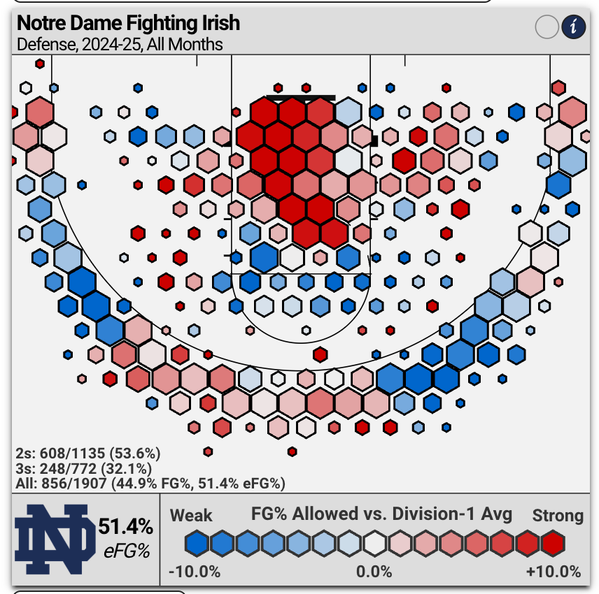 Herein lies the limitations Notre Dame must overcome, which became a glaring issue against stiffer ACC competition last season. The Irish compact defensive structure was able to limit close proximity looks, for the most part. However, when opponents cracked that shell structure, it was game over. Per Haslametrics.com, ND allowed opponents to shoot 63% at the rim last year (bottom 30 nationally overall) and the CBBAnalytics.com shot chart below brings to light this interior blood bath: