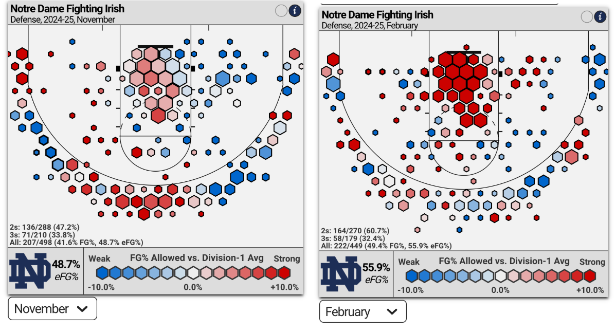 Now, look at the stark difference in the Irish’s defensive shot chart for the month of November (not that bad) compared to the month of February (very bad):