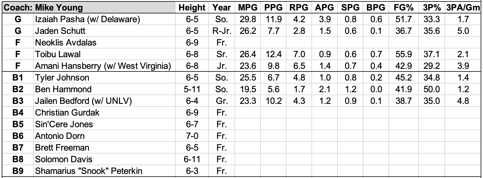The floor spacing should be upheld by a solid supporting cast, who masquerated as go-to guys on last year’s talent poor team. Jaden Schutt is the best of the bunch but Tyler Johnson and Ben Hammond will be woven in as well. Young also added a microwave supersub in Jailen Bedford, who can get buckets in bunches off the pine. Bedford led the entire Mountain West in shot usage rate last year, so Young would be wise to cap his minutes and prevent him from hijacking the offensive flow. However, his scoring outbursts could be life savers during any offensive droughts. As a bonus, Bedford is a legitimate defender on the other end as well (Young considers him his best on ball defender).