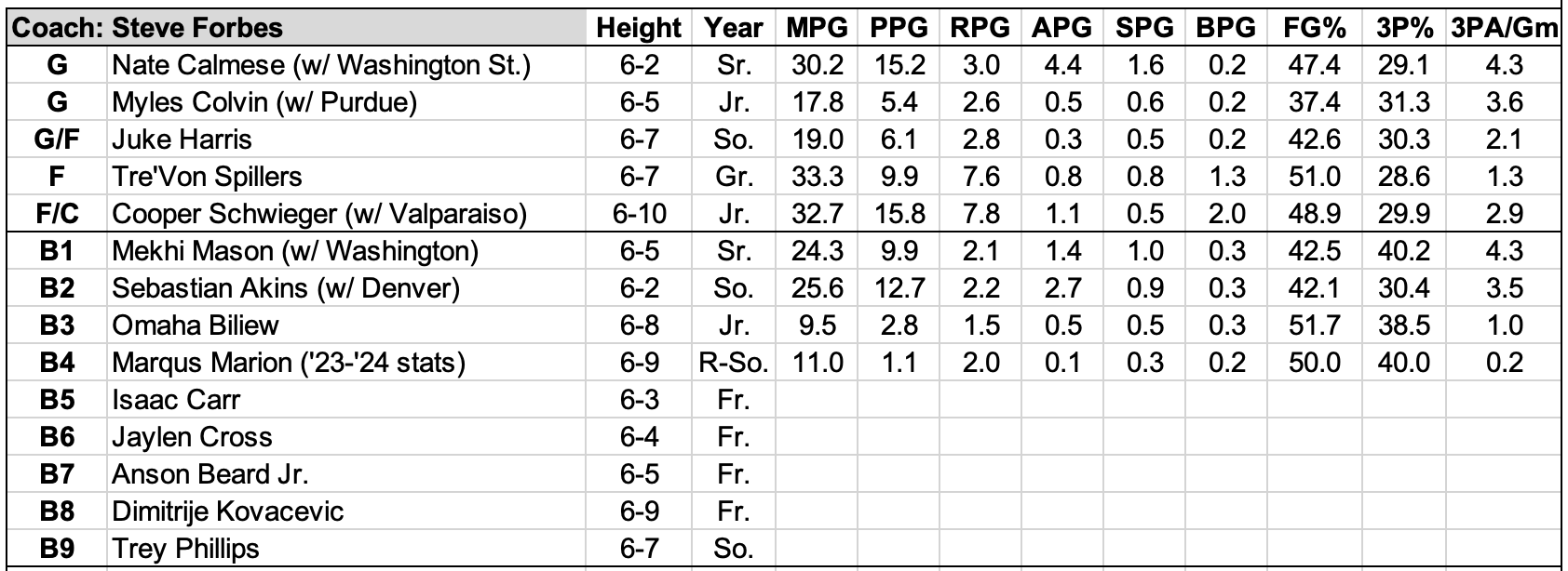 Rebounding was a problem at times last year, even with Reid roaming the middle, but Cooper Schwieger could be a remedy in that department. In a stout Missouri Valley Conference arena, Schwieger emerged as a defensive presence up front defensively, to go along with his rebounding production. On the other end, don’t be surprised to see this system unlock his passing ability, if Forbes deploys him as an internal hub on offense. In spite of his low ish assist rate last year at Valpo, he set up a ton of open shots with the defensive attention he drew.