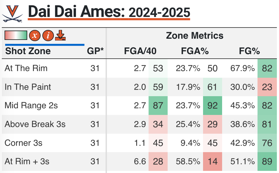 Virginia transfer Dai Dai Ames isn’t a pure point guard but he’s a willing passer and much improved. His percentages were strong from all three levels last season, and his skills may be elevated by a more modern offensive construct.
