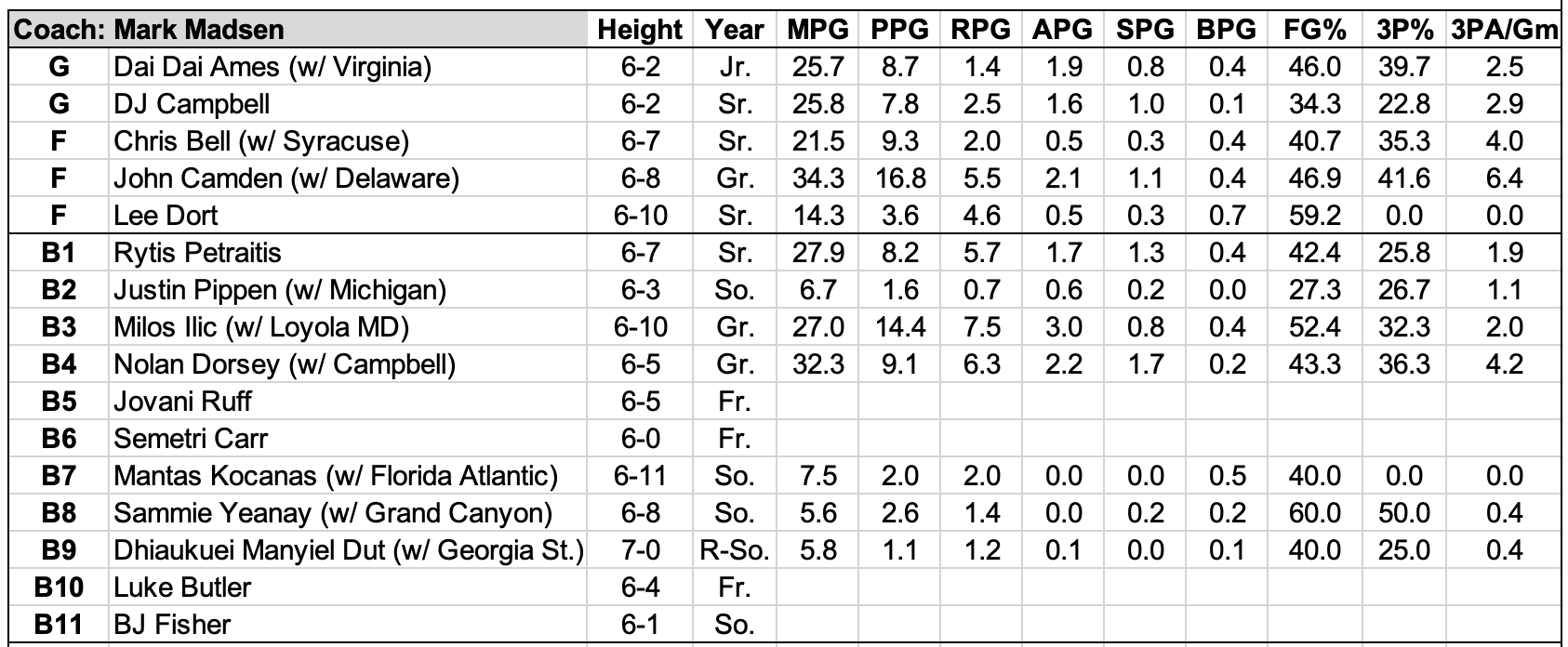 Tae Davis is a big loss, primarily on the offensive end, so Shrews tapped into the portal to find another skilled playmaker 4-spot. In steps Carson Towt, a highly productive offensive engine at NAU and elite rebounder. He’s not as dominant as an interior scorer and finisher as Davis was but he’s quite crafty. Plus, he may be an upgrade from a passing perspective, and thus might be a more effective connecting glue guy on offense.