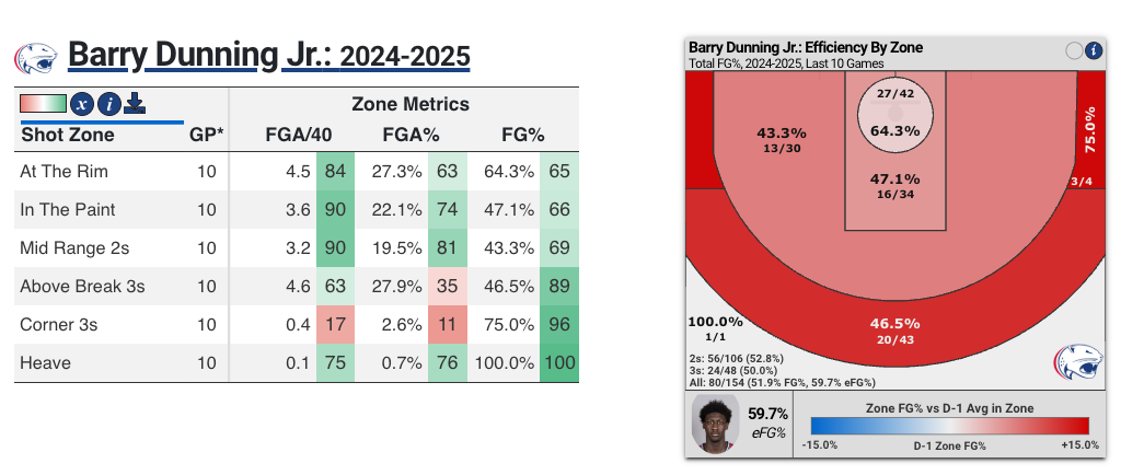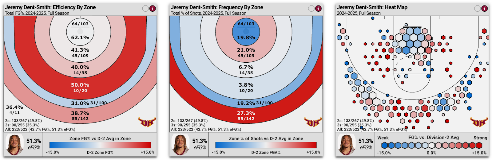 However, the secret sauce in ‘JDS’ repertoire might be the gravitational pull he has on defenders because he will pull up from anywhere, anytime. Per CBBAnalytics, Dent-Smith took over 27% of his shots last year from 25 feet or further, and canned a healthy 38.7% of those attempts.