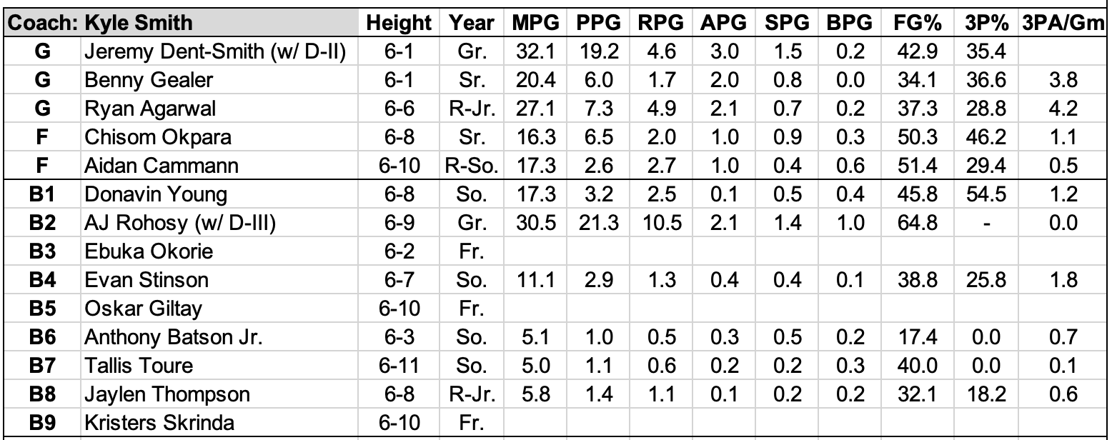 The continuity around Dent-Smith is strong, including three established rotational pieces with multiple years of experience under their belt. Chisom Okpara is the most talented of the bunch, and now he has a clear stage to showcase his talents with Raynaud gone. Benny Gealer and Ryan Agarwal are the other two and they’re rare commodities as fourth year players with the same program. Gealer is the spot up sharpshooter while Agarwal brings a little more versatility to the table. Agarwal himself was once a lauded shooting prospect but that touch has evaded him the last two seasons. He’s still managed to make an impact as a playmaker and defender.