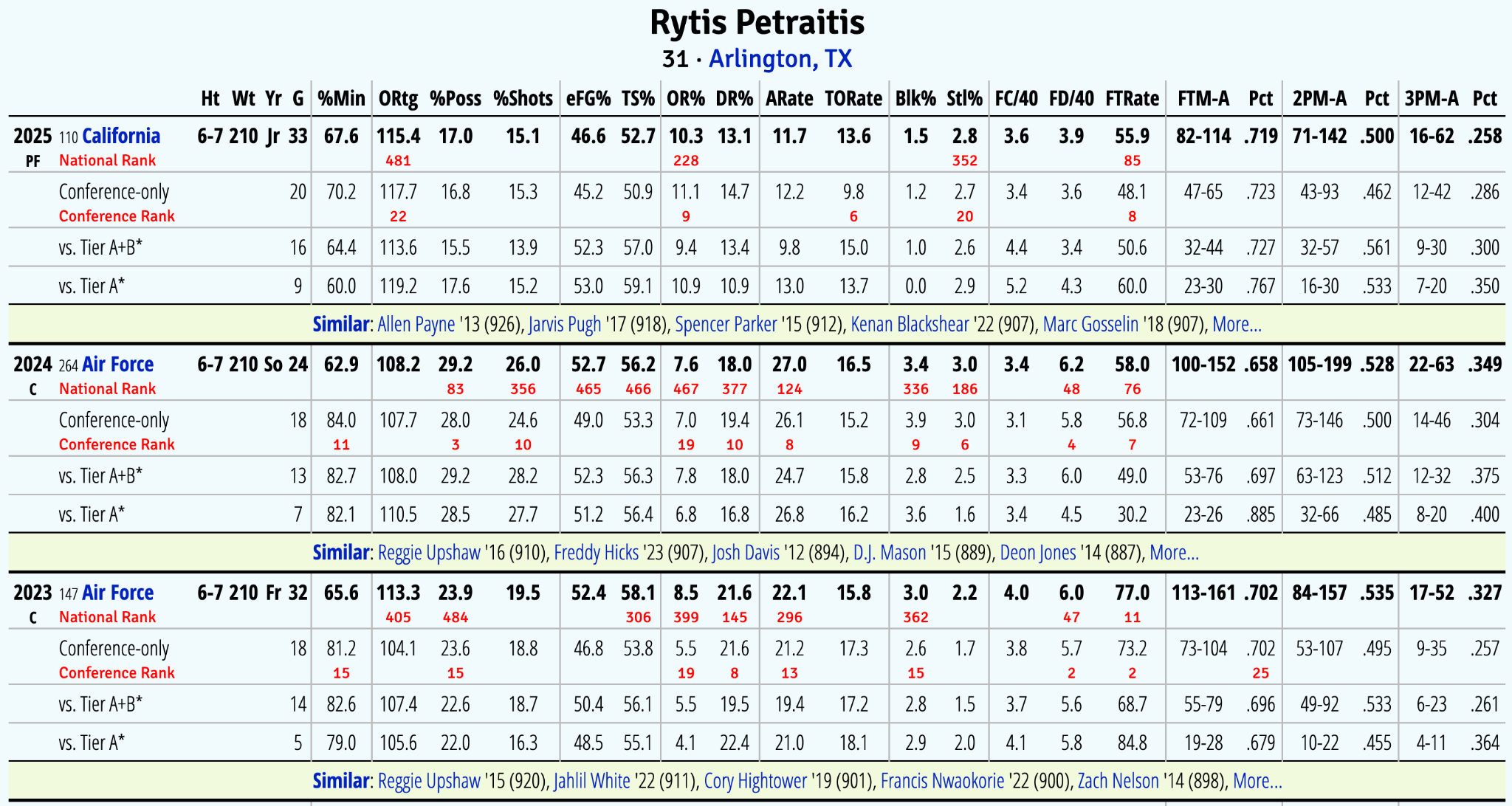 The same is true for Petraitis, who was a dime dropping machine during his dominant days at Air Force. Last season, Madsen couldn’t put Petraitis to good use as a complementary piece, as his assist rate dropped off a cliff from his first two years in Colorado Springs.