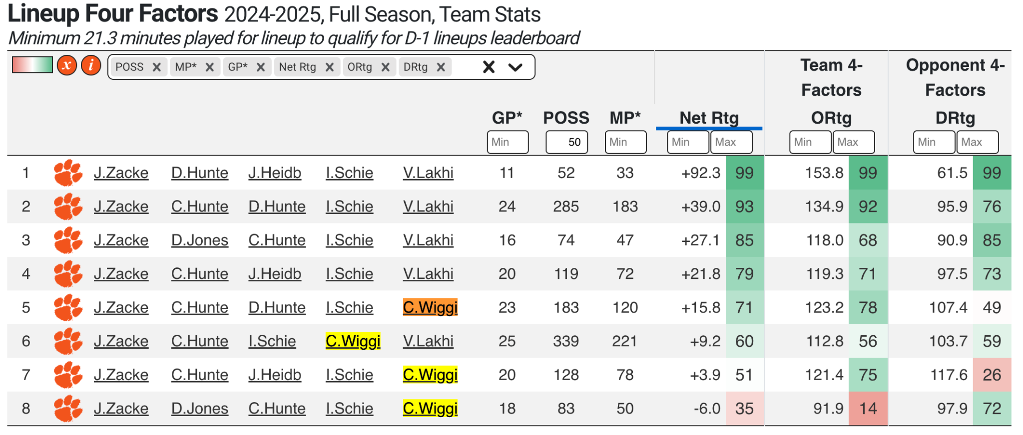 Per the CBBAnalyics.com chart below, of Clemson’s eight most frequently used lineups last season, Wiggins was on the bench for Clemson’s four best groupings (top four rows). It’s not that the Tigers were 'bad' with Wiggins on the floor but, statistically, they were better served playing either Heidbreder or one of the Hunters on the wing instead: