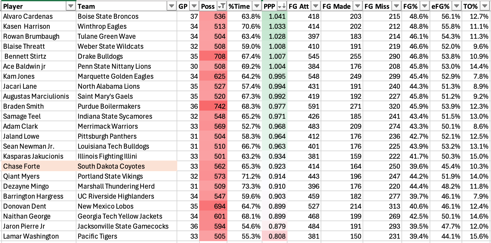 Per Synergy, only 25 players in college basketball accounted for 500 or more possessions as the primary pick-n-roll ball handler (including passes) last year. Of this esteemed group of super high usage lead guards, Forte’s efficiency ranked in the lower half but still in the neighborhood of some marquee names.