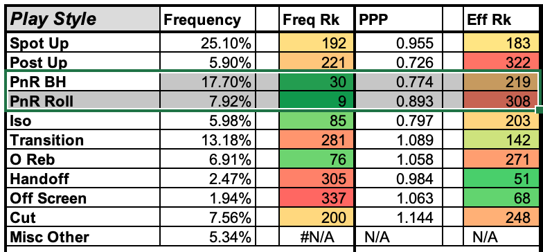 Perimeter shot creation is where the red flags lie. Stoudamire is a huge proponent of pick-n-roll basketball. For reference, one of every four offensive possessions was derived out of ball screen action, via the ball handler or roll man, per Synergy: