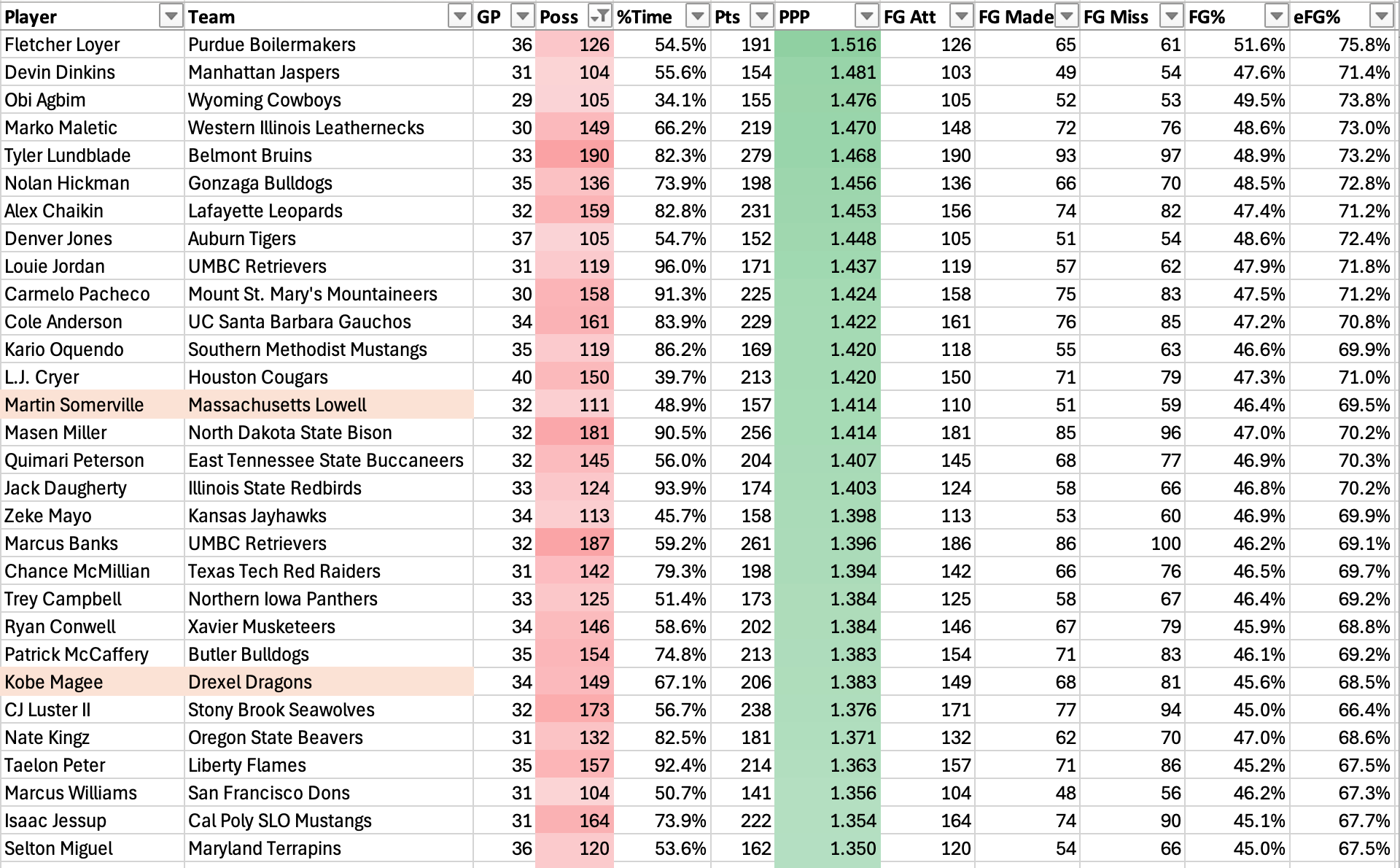 Letting McCray loose in transition and hunt shooters on the perimeter might be the best path forward for the ‘Noles offense. Somerville was a certified bucket at UMass Lowell but he has a proven transferable skillset as a spot up catch and shoot threat. Per Synergy, Somerville made 51 of his 110 triples in catch and shoot situations (46.4%), one of the highest clips in the country. The picture below ranks the top catch and shoot scorers in college basketball last year with over 100 attempts. Somerville, along with teammate Kobe Magee, cracked the top-30 nationally.