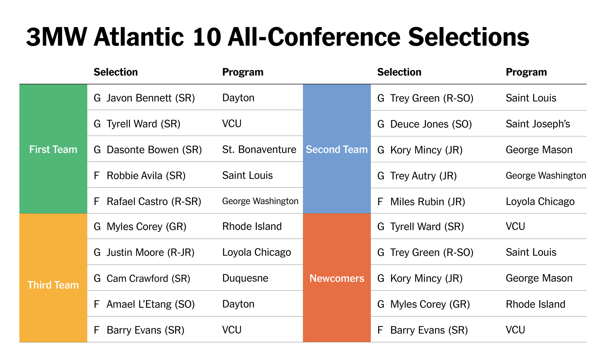 George Washington’s forward tandem will get all the ink - and there’s a host of reinforcements bolstering the wing position as well - but the backcourt is rock solid in its own right. For one, no other A-10 team returns multiple starting guards. A few other challengers retained one cornerstone piece, but Trey Autry and Christian Jones are the only incumbent tandem in the league.