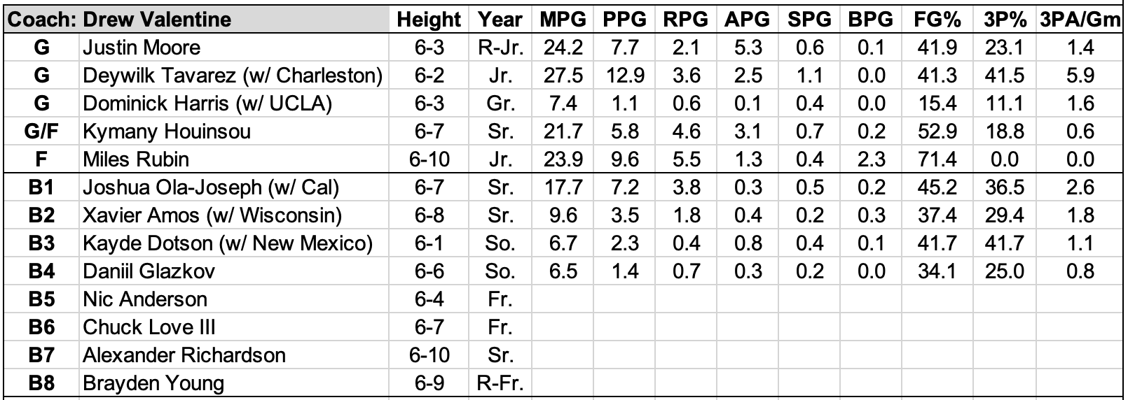 Deywilk Tavarez could offer the best of both worlds. Tavarez is a knockdown catch and shoot sniper, but can also create his own off the bounce. Given the outside shooting concerns attached to point guard Justin Moore, injury risks notwithstanding, Tavarez might prove to be the pivotal signing of Valentine’s portal class. However, the ceiling raiser might be Dom Harris, another long range burner, as seen during a prolific shooting season at LMU two years ago (he was all but forgotten last year at UCLA).