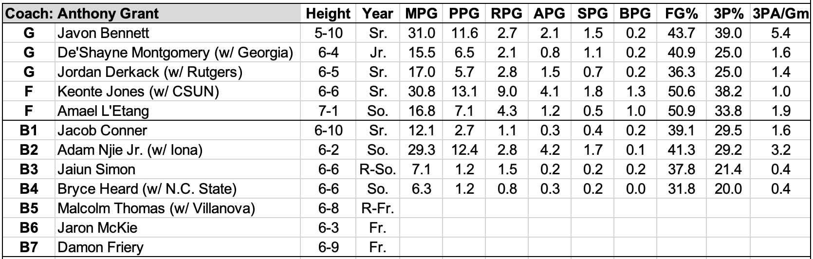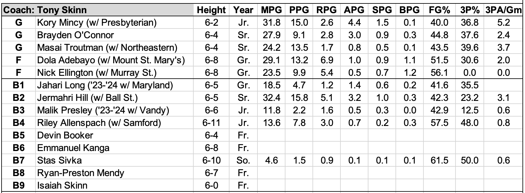 The three familiar faces sticking with Nichols are Truth Harris, Josiah Harris and Justin Archer (who was at Radford before a cup of coffee last season at Georgia State). Collectively, this trio brings a useful understanding of terminology and continuity for all the other new faces. From a production and role standpoint, the smaller Harris is a tenacious attacker and sound shooter while the larger Harris is a gritty lunchpail rebounder and defender up front.