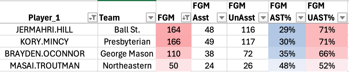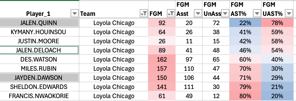 Valentine was smart to attack individual shot making talent in the portal. This was an underrated element in the ‘Blers offensive improvement last year. This offense isn’t super reliant on individual shot making but Loyola did have a ‘go get us one’ guy in Jalen Quinn. Jayden Dawson made his share of tough shots as well but generally out of a set or screening action. The chart below shows the breakdown of field goals made assisted on versus unassisted for Loyola last season.