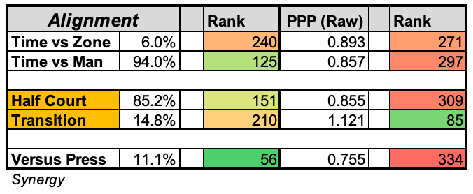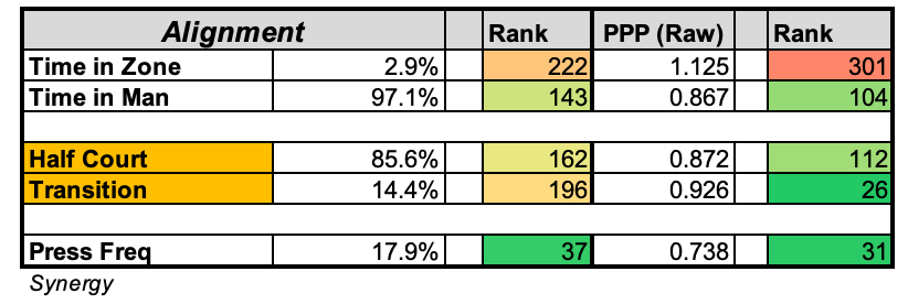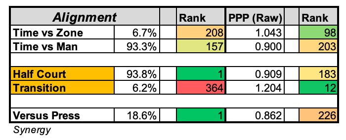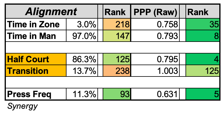 A fascinating find in the Synergy data dive shows that Richmond faced full court pressure more than any other team in the country last season. Additionally, the absence of a confident dynamic handler forced Mooney to slow his offense down to a snail's pace in hopes of limiting turnovers.