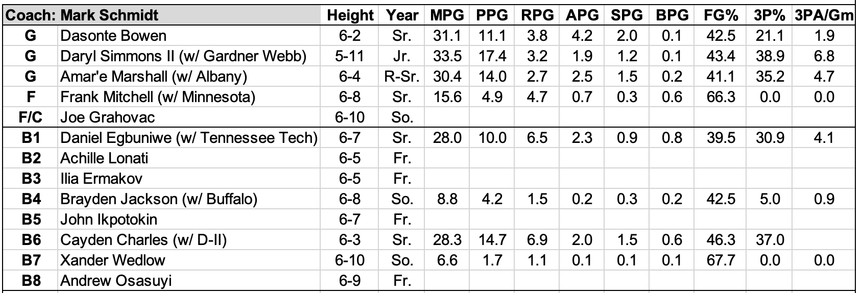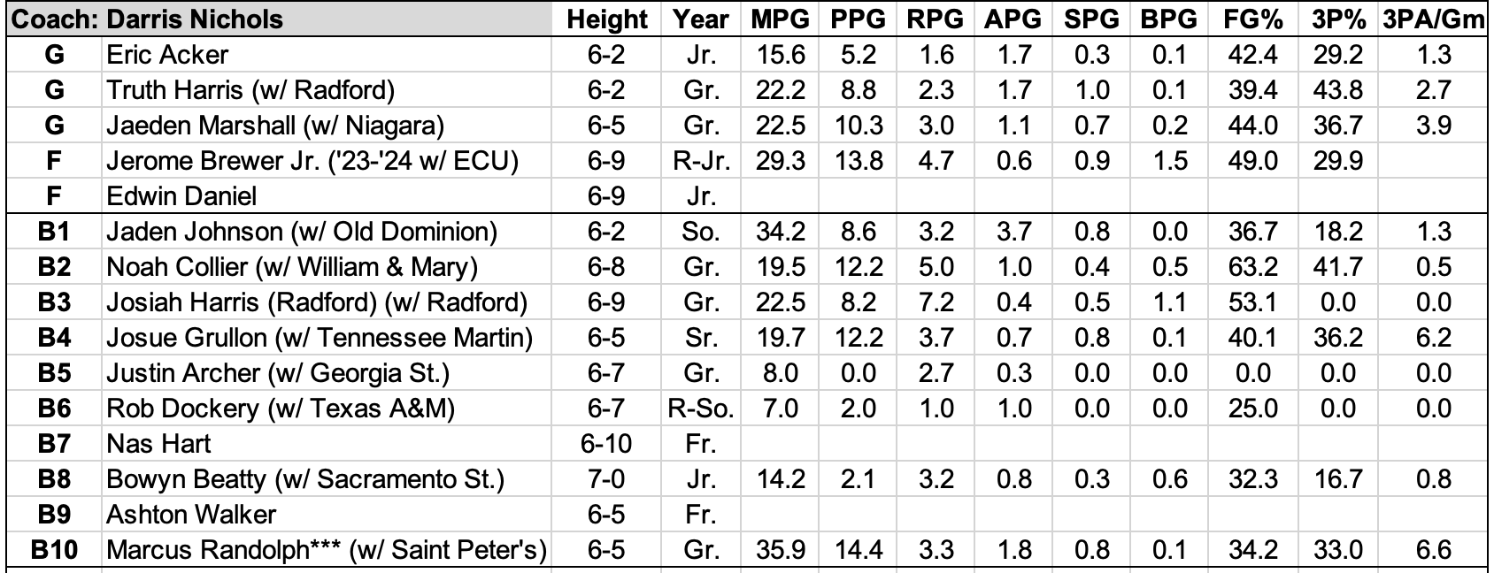 What Daniel lacks in D-I experience, his portal partners, Jerome Brewer, Noah Collier and Marcus Randolph can more than compensate for. All three have lingering medical red flags, which likely explains why Nichols overinvested in his frontline with depth, which explains the rationale behind adding Bowyn Beatty to round out the frontline rotation as insurance. Clearly, rebounding up front is a non-negotiable this year for Nichols.