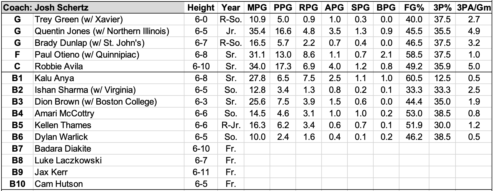 Josh Schertz’s second season at Indiana State was when he seriously turned heads nationally. The slingshot effect this time at SLU may not be THAT elastic but he’s also starting from a much better position of strength. Robbie Avila and Kalu Anya headline a solid crop of returners, many of whom are flying under the radar. The beauty with the depth here this season is those complimentary pieces need not play super high leverage minutes every night out.