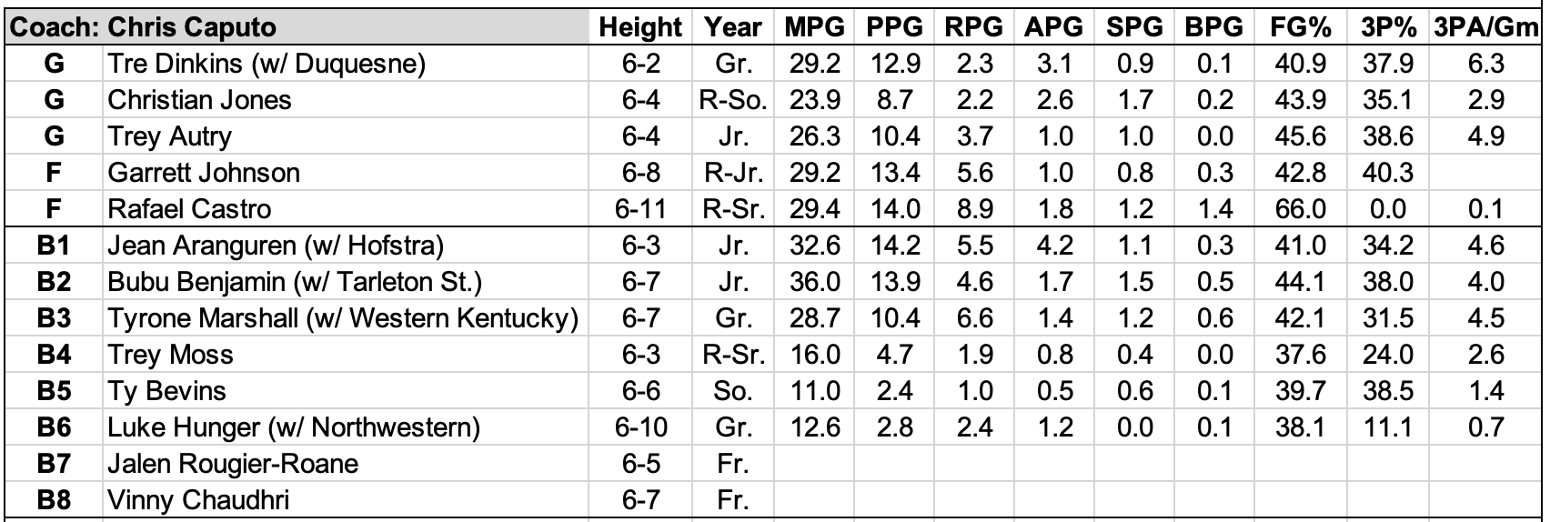 As for depth, well, GW is spoiled with options at all five positions. There’s roughly 11 legitimate players worthy of cracking the rotation, including two seasoned incumbents, Trey Moss and Ty Bevins. Caputo didn’t even need to sign four highly productive transfers but Tre Dinkins, Jean Aranguren, Bubu Benjamin and Tyrone Marshall are all starter caliber A-10 players. Three of that foursome are likely coming off the bench to start the year.
