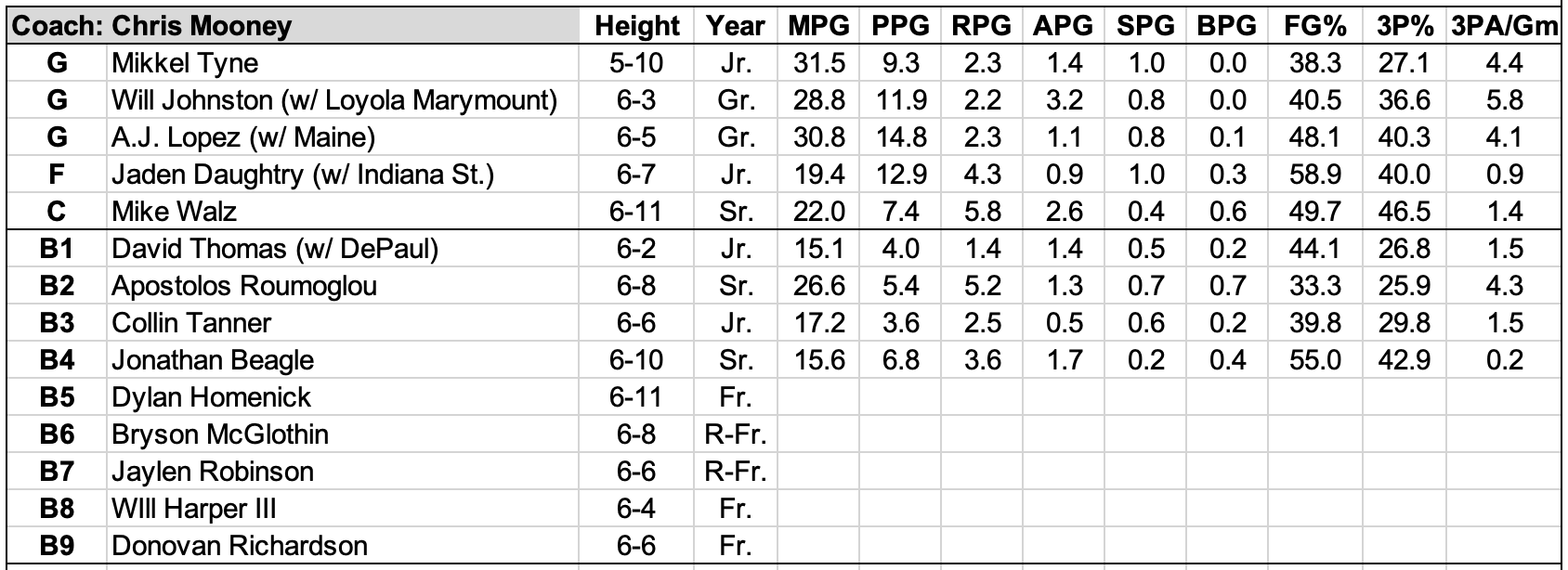 The three multi-year mainstays are Mikkel Tyne and Mike Walz, the notable bookends returning at the point and at center, and Collin Tanner, a key reserve on the wing. Tyne and Walz shoulder heavy responsibility offensive, especially Walz, given the unique roles bigs play in this offense.