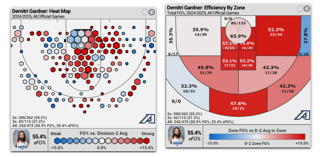 Demetri Gardner is the D-II wildcard with an unorthodox power guard toolbox. Gardner was a midrange assassin at the D-II level, and loves to post up smaller guards, who he can bully and shoot over from close range. He’ll have to get his shot off over longer defenders this season but that middle game should translate to this level. (shouts to CBBAnalytics for the hyper detailed shot map):