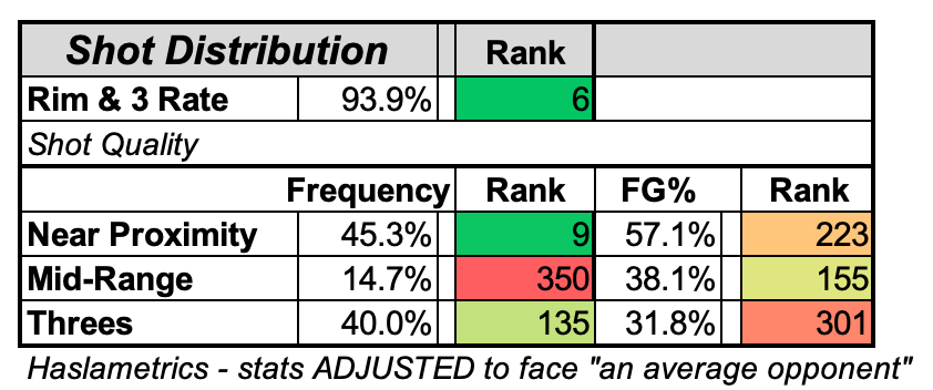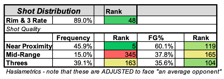 A full autopsy of last season isn’t necessary with a totally new cast of characters but the Rams’ recipe for success - at least early on when it was working - was a relentless pursuit of the rim, especially in transition. Archie revved up the pace to attack early offense, enabling his athletic guards and wings to pick up steam in the open floor. The Rams also boasted two imposing post presences in Javonte Brown and David Fuchs, creating a team shot diet heavily tilted towards the rim and ‘near proximity’ looks, as confirmed by the advanced data from Synergy and Haslametrics.com below: