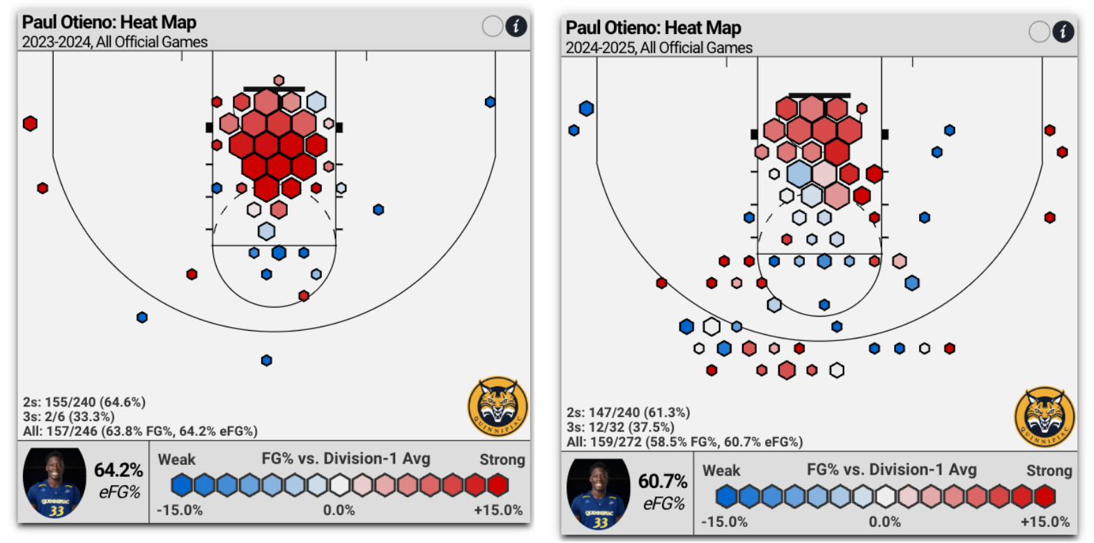 While Otieno broadened his offensive repertoire last season at Quinnipiac, he still knows where his bread his buttered: at the rim, as the shot charts from the last two seasons from CBBAnalytics.com show below.