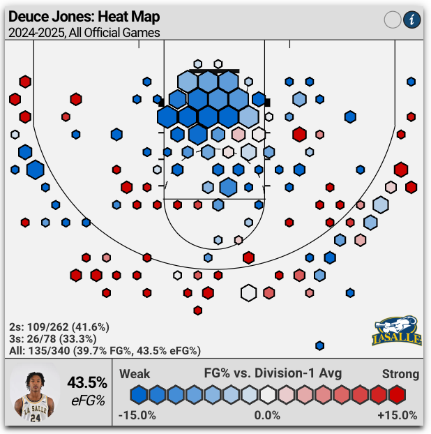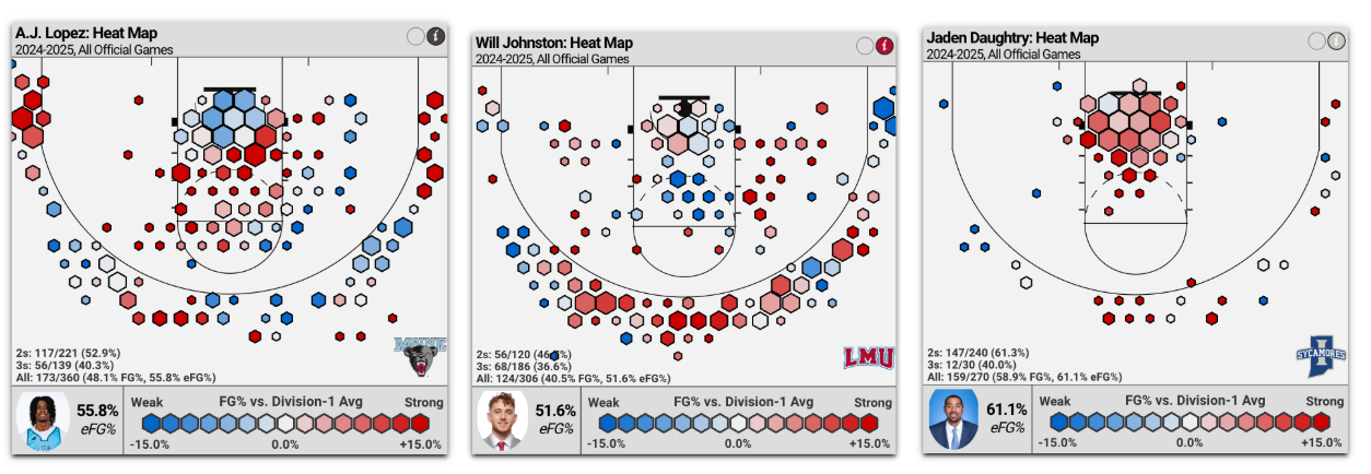 There’s a neat inside, middle and outside balance in Jaden Daughtry, AJ Lopez and Will Johnston’s shot diet. Lopez is especially effective in the midrange, Daughtry does his damage in the restricted area, and Johnston can ring the bell from long distance.