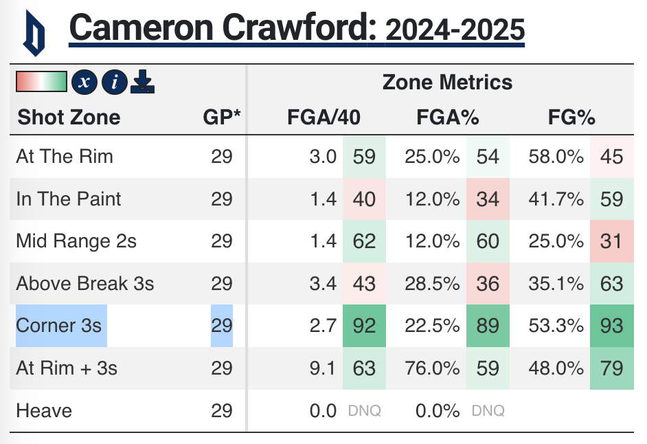 Much like Montgomery, Derkack’s effectiveness is predicated on getting to the rim and scoring or drawing contact. Derkack was a terrible fit at Rutgers, where his playmaking was overshadowed by Dylan Harper and Ace Bailey. Derkack only converted 27% from long distance at Merrimack but he managed to make 40% from the corner, per CBBAnalytics.com shot chart splits (granted, on a small sample size). Grant will need to find a spot for Derkack to be effective off the ball and without the rock, thus, deploying him as a baseline cutter and spot corner shooter is a viable option.