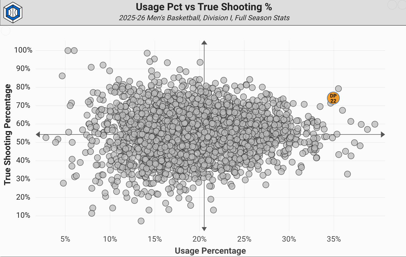 It’s a stark change from last season’s offense, run by current Brooklyn Net Egor Demin and new Virginia Cavalier Dallin Hall, who ran an offense that resulted in 59.6% of their field goal makes being assisted (32nd highest in the country). The five-out that Young is running this year depends more on player isolation and Dybantsa and Wright’s elite speed, resulting in an assist rate of 41.1%, in the bottom 8th-percentile in Division I.