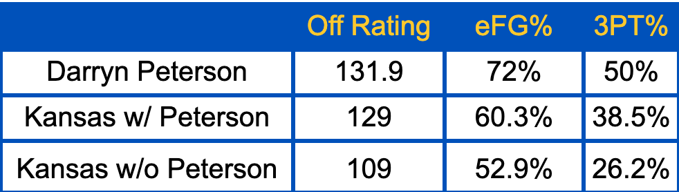 In the two games Peterson played, the Jayhawks lived through the top-ranked 2025 recruit. The shooting guard had a usage of 34.6% while averaging 21.5 points on an effective field goal rate of 72%, looking every bit the part of a potential top of the draft prospect.