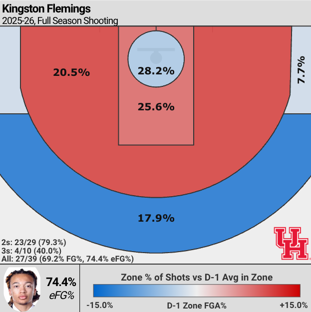 But the player comparison I didn’t expect for this Sampson freshman class is that point guard Kingston Flemings is comfortable getting downhill to a level reminiscent of Jamal Shead. Flemings is what a lab would put together when tasked with creating the ideal Sampson guard. The 6-foot-4 Texan possesses speed and athleticism that pair incredibly well with his driving handles and a verticality we haven’t seen from the Coogs’ previous point guards. He's proven an ability to score at the rim (81.8% on 11 attempts) and in the paint (90% on 10 attempts).